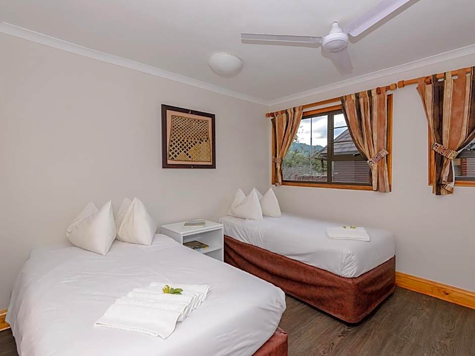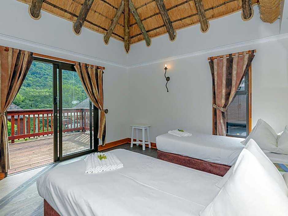 This self-catering, 2-bedroom chalet has a fully-equipped kitchen, bathroom and a living room with TV and select satellite channels. The chalet is serviced daily except Sundays and Public Holidays.